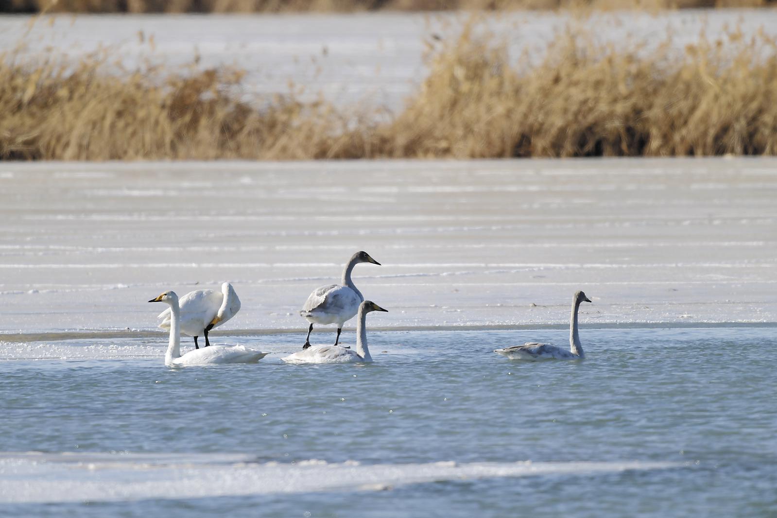 往前走了好一段路,終于看到一群大天鵝的身影。這幾天跑監(jiān)測點(diǎn),幾乎每個地方都能見到大天鵝,它們有的羽毛雪白,有的卻是灰色的。向水鳥監(jiān)測員詢問才得知,灰色羽毛的是亞成體,等長到成年,羽毛就會慢慢變白,而且年齡越大,羽毛越白。這種情況不光大天鵝有,很多鳥都這樣。我之前見過灰色的黑頸鶴,還納悶怎么不是黑色的,原來那也是亞成體,漲知識了。