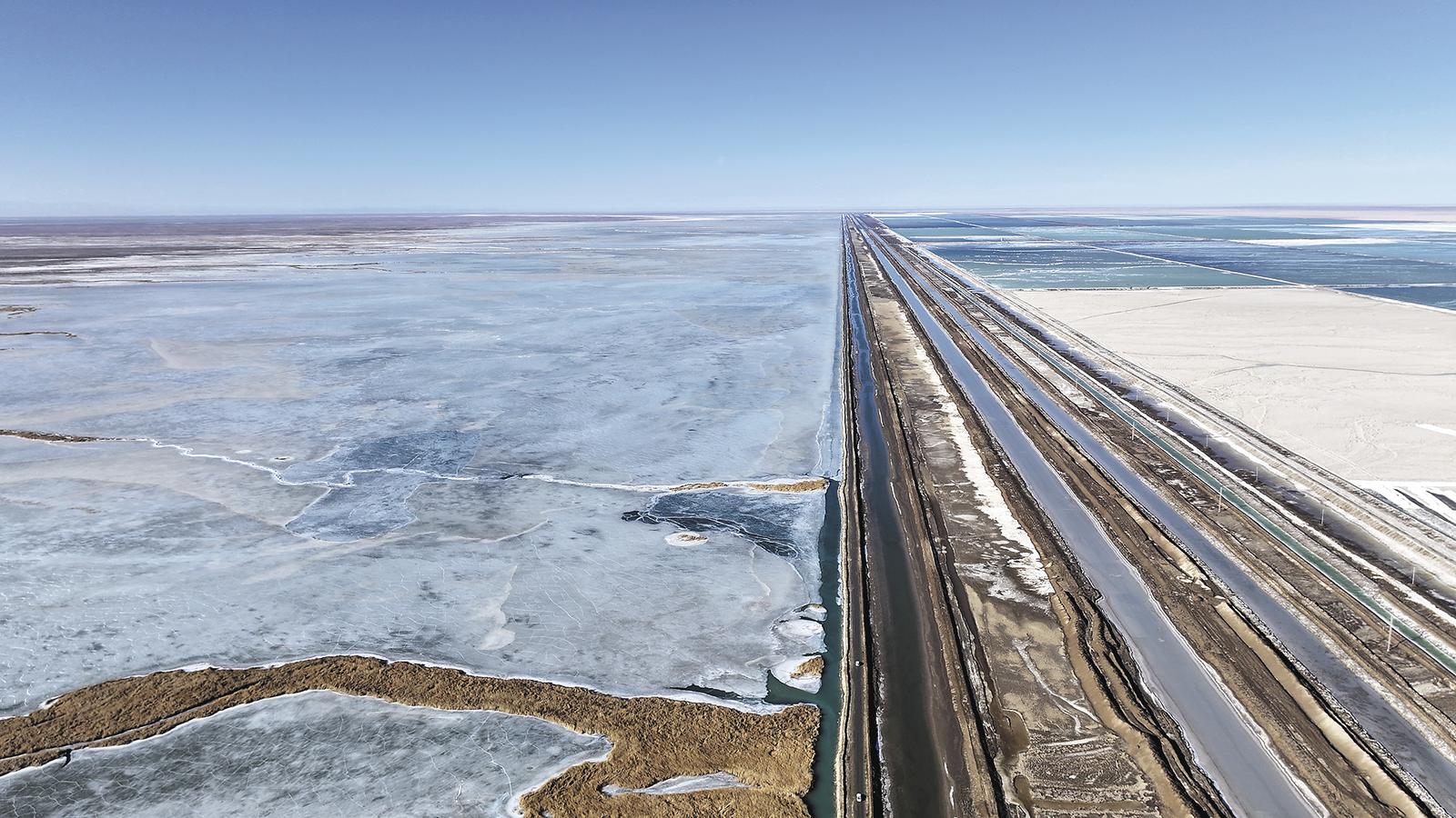 晨曦慢慢爬上察爾汗鹽湖,晶瑩的鹽花反射著刺眼的光,車子開在萬丈鹽橋上,一側(cè)是泛著淺綠色的咸水鹵水,靜靜流淌;另一側(cè)的淡水濕地早已結(jié)冰,邊緣處還有河水在流淌,水里零星游著白骨頂、普通秋沙鴨等常見水鳥。