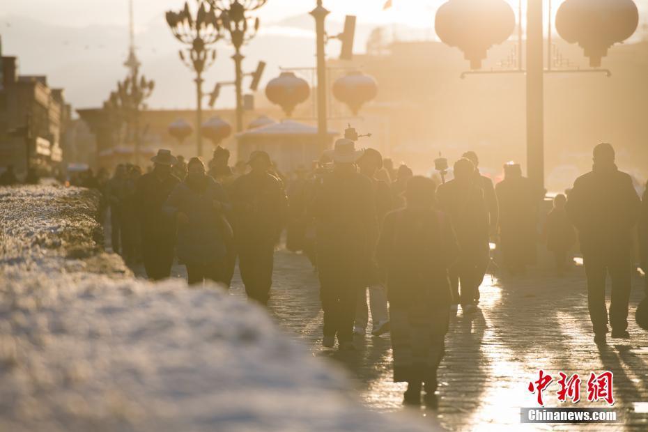 3月10日凌晨時(shí)分,雪域“圣城”拉薩的天空飄起片片雪花,迎來(lái)了今年的又一場(chǎng)降雪。3月的春雪為拉薩披上一層“薄紗”,銀裝素裹景色迷人。圖為雪后,拉薩民眾迎著朝陽(yáng)出行。 文/曾嘉 圖/何蓬磊