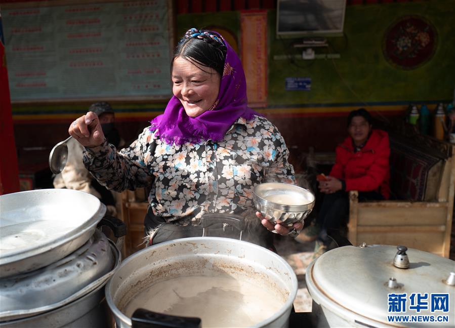 雙湖縣嘎措鄉(xiāng)牧民貢桑曲珍在餐館里為客人盛飯(1月31日攝)。新華社記者 普布扎西 攝