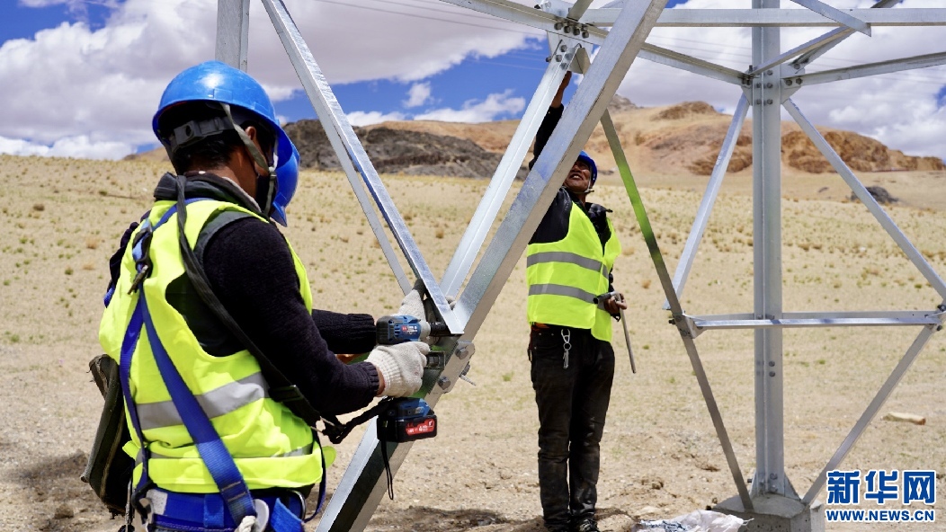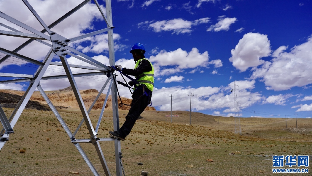 6月25日,西藏措勤縣磁石鄉(xiāng)35千伏輸變電工程現(xiàn)場(chǎng),電力建設(shè)者正在進(jìn)行輸電線路隱患排查。新華網(wǎng) 達(dá)珍 攝