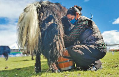 圖為牧民在擠牦牛奶。