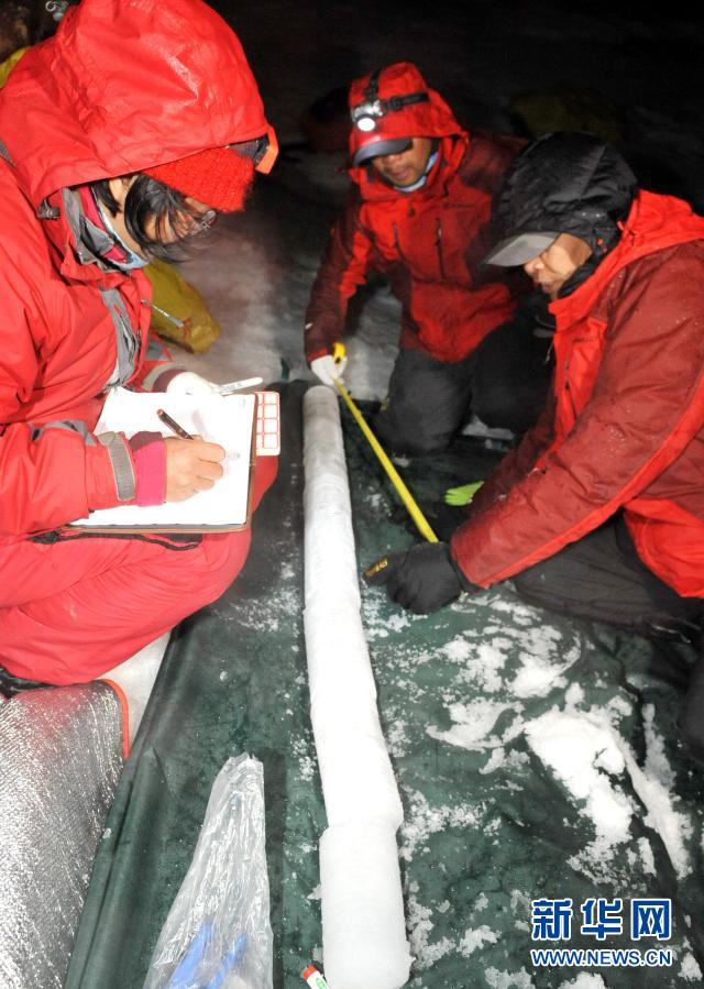 2017年7月1日,第二次青藏高原綜合科考冰川與環(huán)境變化考察隊(duì)前往龍匣宰隴巴冰川末端鉆取冰芯。這是科考隊(duì)員丈量、標(biāo)記、裝封冰芯。新華社發(fā)(索朗羅布 攝)