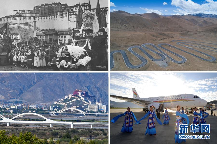 拼版照片:左上是1954年12月25日,康藏(今川藏)、青藏兩條公路勝利通車(chē)到拉薩。圖為在布達(dá)拉宮前舉行的盛大通車(chē)儀式(資料照片);左下是青藏鐵路列車(chē)抵達(dá)拉薩(2016年6月27日新華社記者普布扎西 攝);右上是通往珠峰的公路(2017年5月19日新華社記者普布扎西 攝)右下是西藏航空有限公司正式通航(2011年7月26日新華社記者 覺(jué)果攝)新華社發(fā)