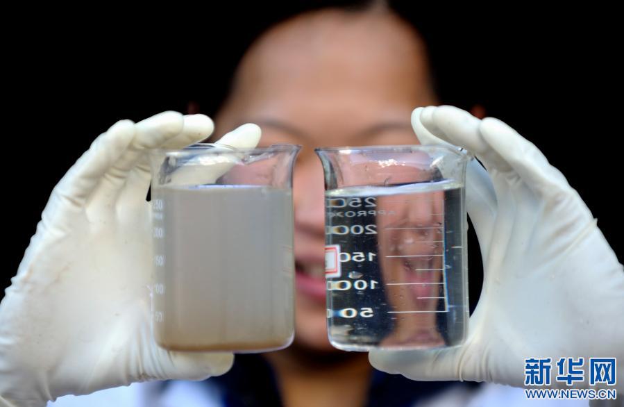 在西藏昌都污水處理廠,一名工作人員在展示污水處理結果(2010年10月6日攝)。新華社記者 普布扎西 攝
