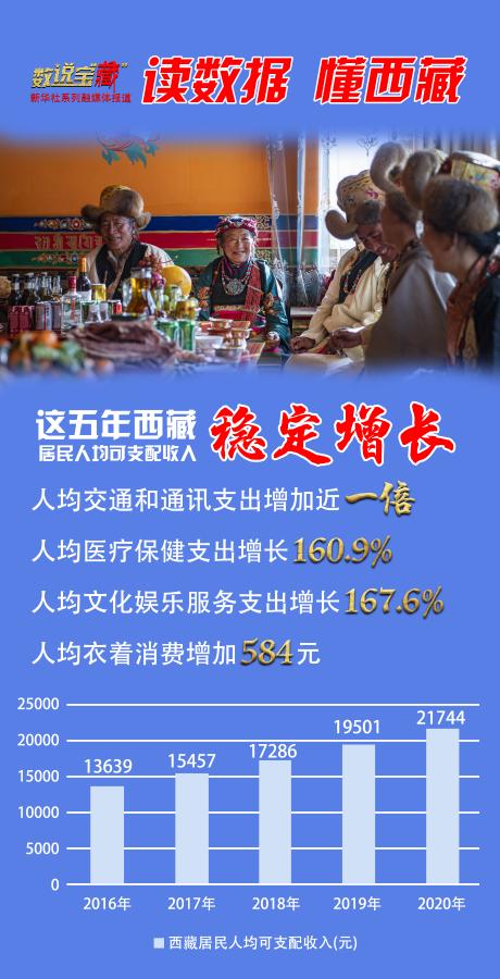 “十三五”期間,在中央和地方一系列政策措施的推動(dòng)下,西藏居民收入持續(xù)攀升。西藏自治區(qū)政府統(tǒng)計(jì)數(shù)據(jù)顯示,2020年西藏居民人均可支配收入達(dá)21744元,較2015年增長(zhǎng)77.4%。