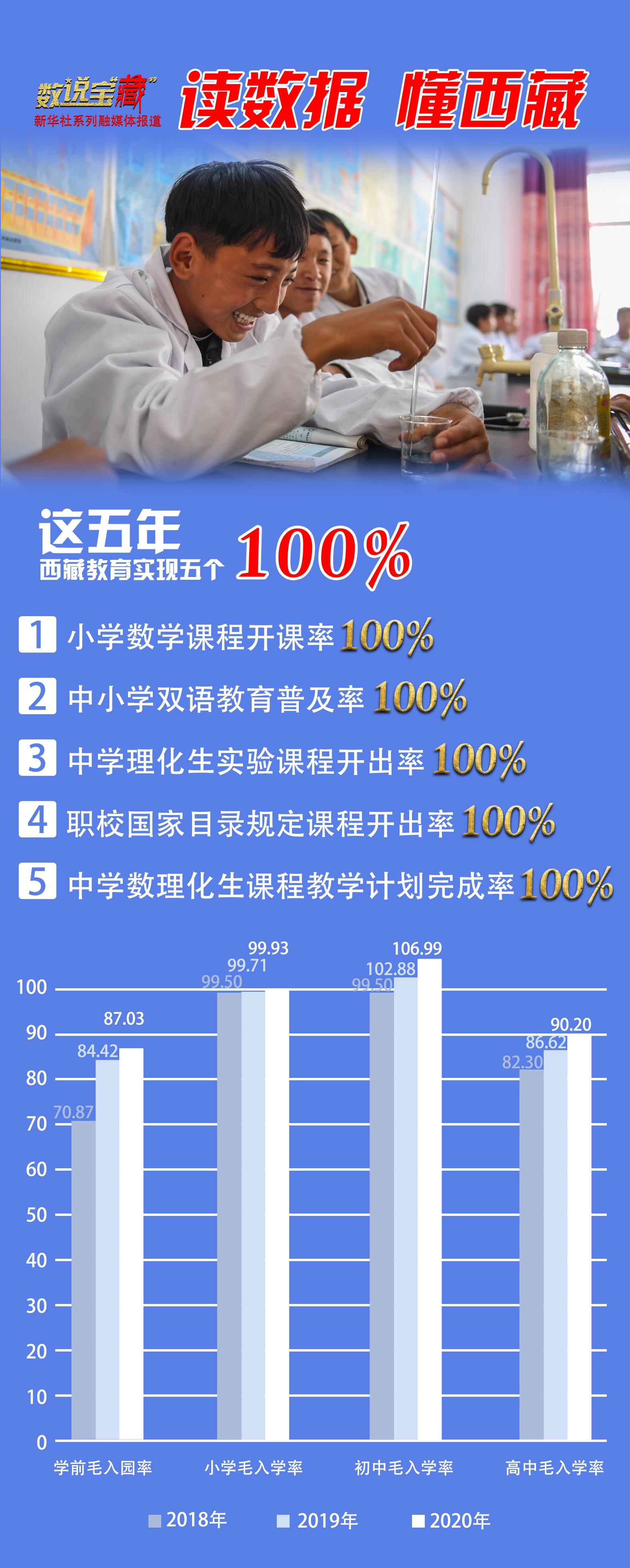 “五個(gè)100%”教育目標(biāo)是西藏基礎(chǔ)教育重點(diǎn)工程的主要內(nèi)容,于2016年正式確定。西藏在資金投入、教師培訓(xùn)、實(shí)驗(yàn)設(shè)備和儀器配備等方面給予學(xué)校支持,并重點(diǎn)加強(qiáng)理科教學(xué)和實(shí)驗(yàn)教學(xué),強(qiáng)化教師專業(yè)技能培訓(xùn)。對(duì)此,西藏先后投入2.12億元新建中小學(xué)實(shí)驗(yàn)室60萬平方米,投入1.99億元采購中小學(xué)實(shí)驗(yàn)教學(xué)儀器設(shè)備等。