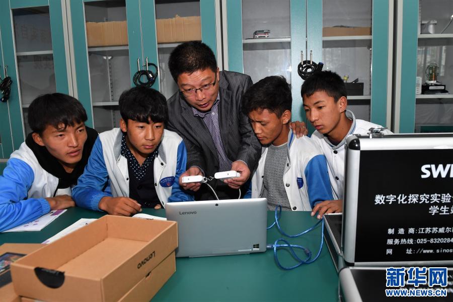 在西藏日喀則市第一高級(jí)中學(xué),來自山東省煙臺(tái)市海陽四中的物理老師魯旭(中)在指導(dǎo)高三學(xué)生進(jìn)行物理課分組實(shí)驗(yàn)(2017年8月23日攝)。新華社記者 張汝鋒 攝