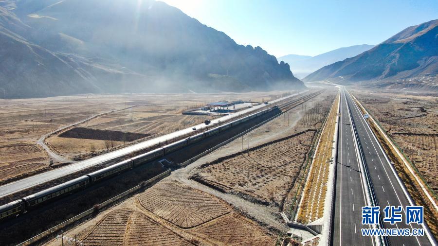 這是拉薩至那曲高等級(jí)公路(右)和青藏鐵路沿線風(fēng)光(1月28日攝,無(wú)人機(jī)照片)。新華社記者 晉美多吉 攝