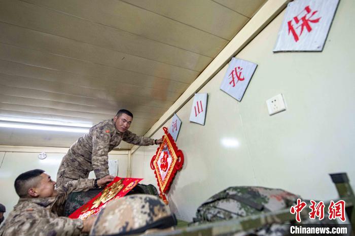 保溫方艙內(nèi),該旅官兵正在用“福”字精心點綴裝飾。 王述東 攝