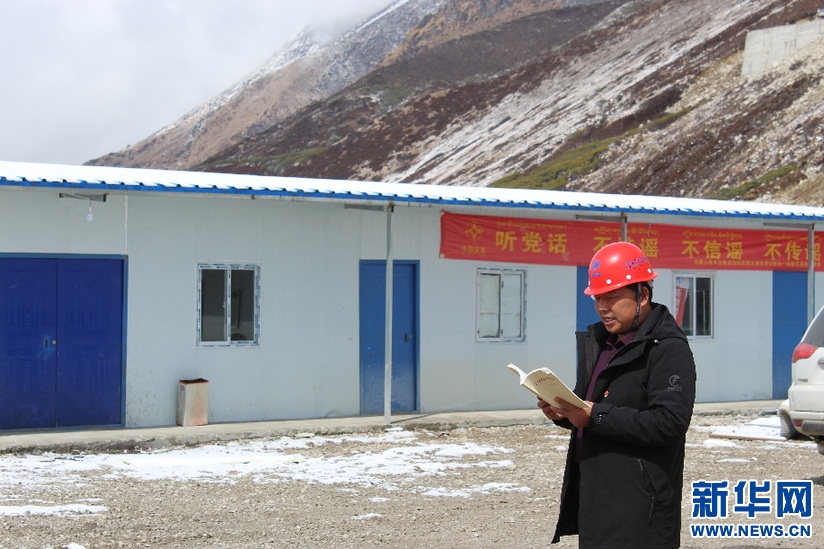 姚紅紀在拉康項目施工點為工人講黨課(4月24日攝)。新華網(wǎng)發(fā) (王雙雙攝)
