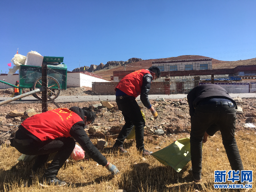 區(qū)黨校駐村工作隊組織在家牧民黨員在學校、廣場、村委會等場所集中清理生活垃圾和建筑垃圾(4月29日攝)。新華網(wǎng)發(fā) 王煦樟攝