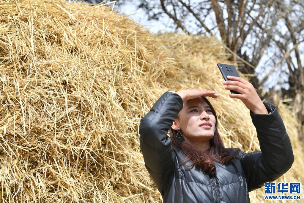 扎西拉姆在山南市瓊結縣久河村的家里通過網(wǎng)絡直播和“粉絲”們交流(4月2日攝)。 新華社記者 孫瑞博 攝