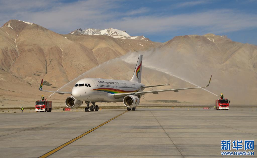 2020年7月1日,阿里昆莎機(jī)場通航10周年,飛機(jī)穿過水門。新華社記者田金文 攝