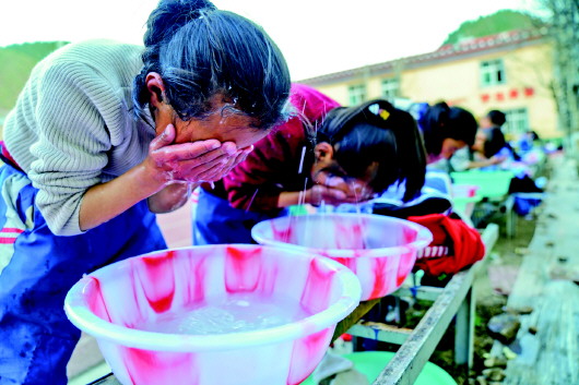 4月30日,在類(lèi)烏齊縣桑多鎮(zhèn)第二小學(xué),學(xué)生們用熱水洗漱。這套熱水設(shè)施由李純民發(fā)起的“齊興”助學(xué)獎(jiǎng)勵(lì)基金捐助。 記者劉金海、黃臻攝