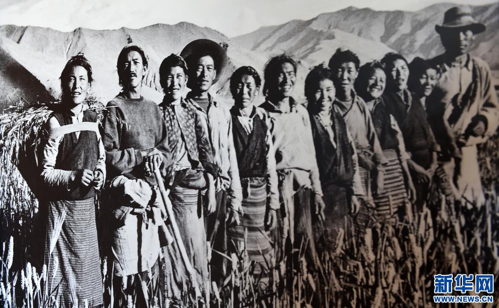 次仁拉姆(左一)當(dāng)年和互助組成員在田間合影(資料照片)。新華社發(fā)