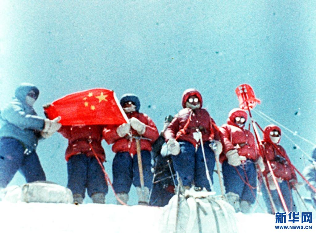 1975年5月27日,中國登山運動員索南羅布、羅則、侯生福、桑珠、大平措、貢嘎巴桑、次仁多吉、阿布飲、潘多從北坡登上珠峰峰頂。新華社發(fā)