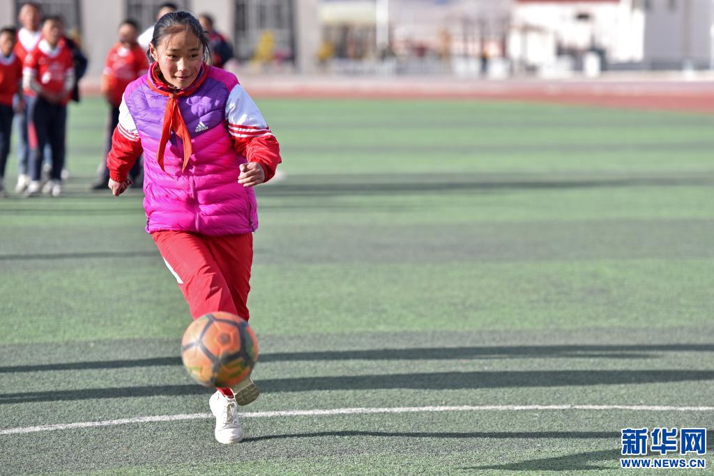 藏族姑娘多吉卓瑪在當(dāng)雄縣龍仁鄉(xiāng)小學(xué)參加學(xué)校的足球興趣課。新華社記者孫瑞博攝
