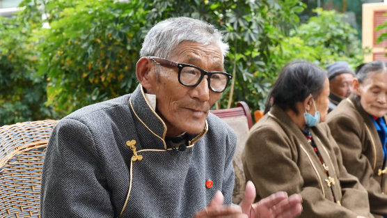 阿里地區(qū)老人護(hù)理院老人 拉松(藏語(yǔ)):護(hù)理員們經(jīng)常給我們洗頭、洗澡、剪指甲,就像對(duì)待自己的親生父母一樣照顧我們,不嫌臟。好吃好喝都有,平時(shí)還可以跟其他老人一起玩玩骰子、打打撲克,很開(kāi)心、很快樂(lè),這都是國(guó)家的恩惠。