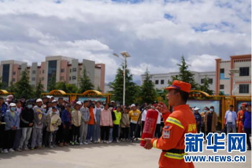 西藏森林消防總隊指戰(zhàn)員到西藏自治區(qū)兒童福利院教授孩子們使用滅火器(6月12日攝)。施福壽攝