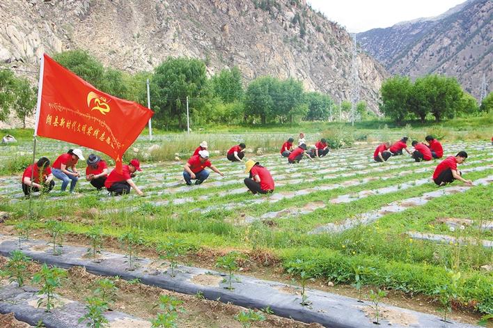 圖為西藏自治區(qū)林芝市朗縣新時(shí)代文明實(shí)踐志愿服務(wù)隊(duì)來到洞嘎鎮(zhèn)達(dá)木村,幫助當(dāng)?shù)卮迕窀赊r(nóng)活。