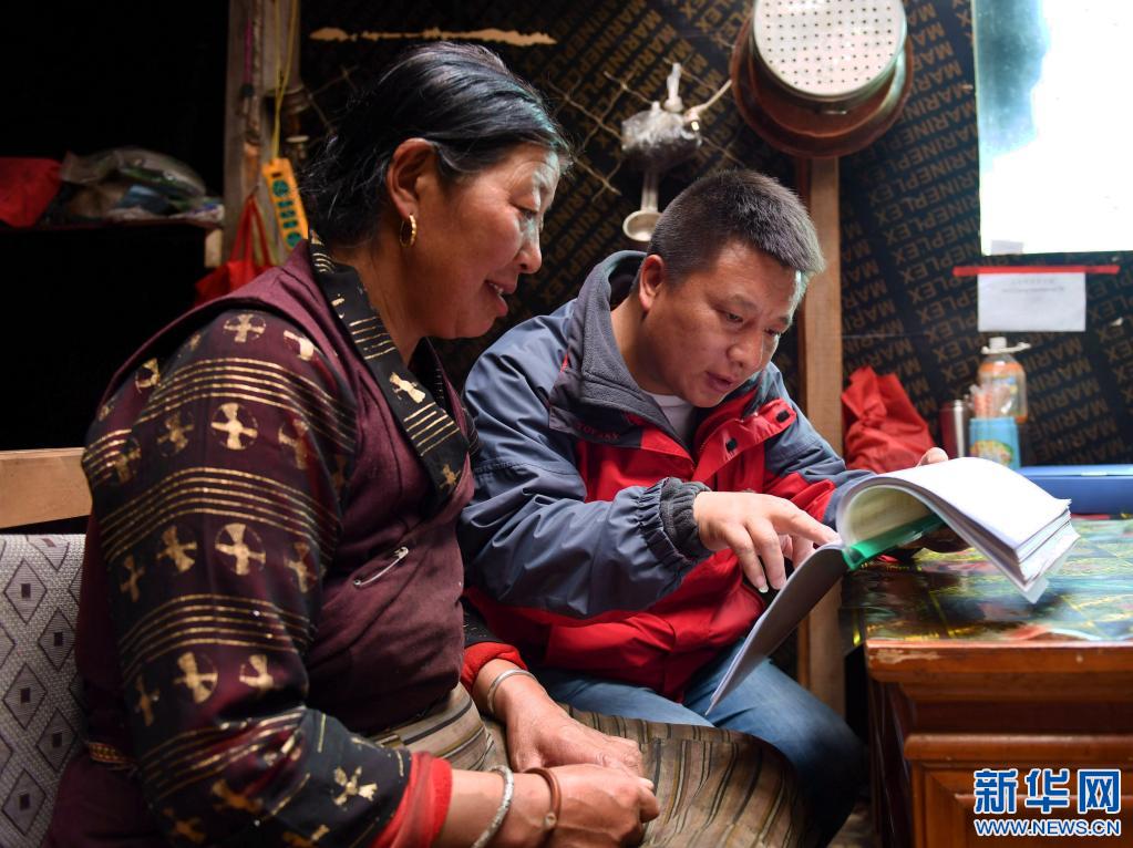 西藏山南市社保工作人員在隆子縣玉麥鄉(xiāng)玉麥村村民央宗家中進行社保信息補充登記。新華社記者 晉美多吉 攝