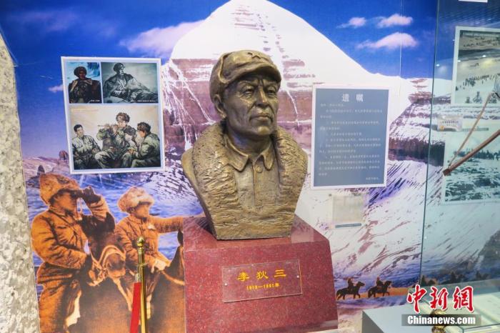 近日,中新社記者隨采訪團(tuán)重走上世紀(jì)50年代中國(guó)人民解放軍進(jìn)藏先遣連的入藏路線。圖為南疆軍區(qū)某合成團(tuán)1連榮譽(yù)室,雕像是進(jìn)藏先遣英雄連總指揮李狄三。 中新社記者 楊程晨 攝
