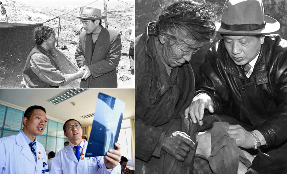 左上圖為來自陜西的援藏干部、阿里日土縣副縣長賈冗勇深入牧區(qū),幫助藏族牧民解決生產(chǎn)、生活的實際困難(新華社記者土登攝,1997年11月11日發(fā));左下圖為2017年8月3日,北京積水潭醫(yī)院援藏醫(yī)生龔曉峰(右)和北京天壇醫(yī)院援藏醫(yī)生李家謀在拉薩市人民醫(yī)院骨科病房內(nèi)查看患者的X光片,進行工作交接(新華社記者晉美多吉攝);右圖為孔繁森(右)在阿里日土縣過巴鄉(xiāng)為孤寡老人益西卓瑪治?。ㄐ氯A社記者土登攝,1994年12月26日發(fā))。