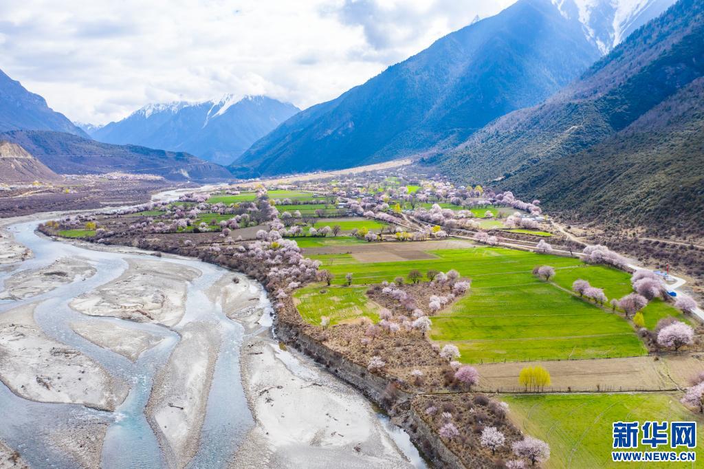 西藏林芝市波密縣境內(nèi)桃花盛開的田園風光(2020年3月26日攝,無人機照片)。新華社記者普布扎西 攝