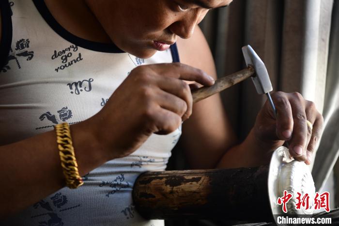圖為工人正在鏨刻花紋。貢嘎來松 攝