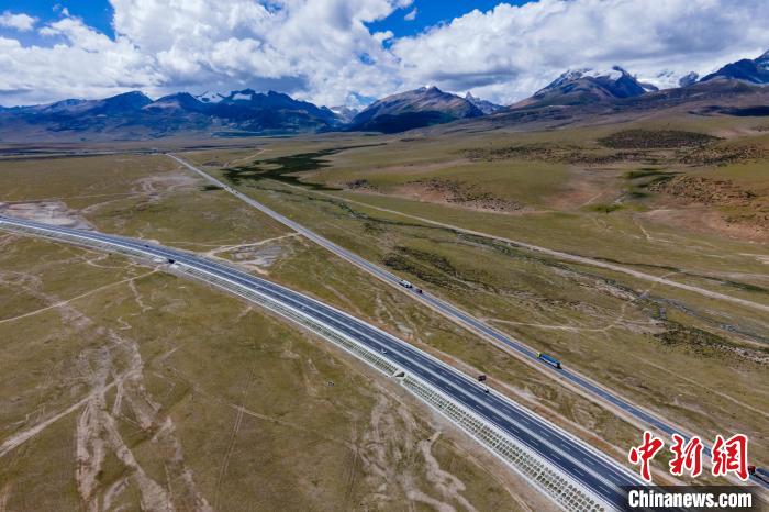 那拉高速(畫(huà)面下方)、青藏公路和遠(yuǎn)處的雪山?!〗w波 攝