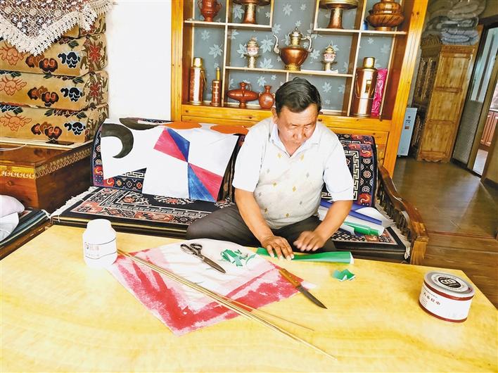 圖為拉薩風箏制作技藝自治區(qū)級代表性傳承人普窮在家制作風箏。