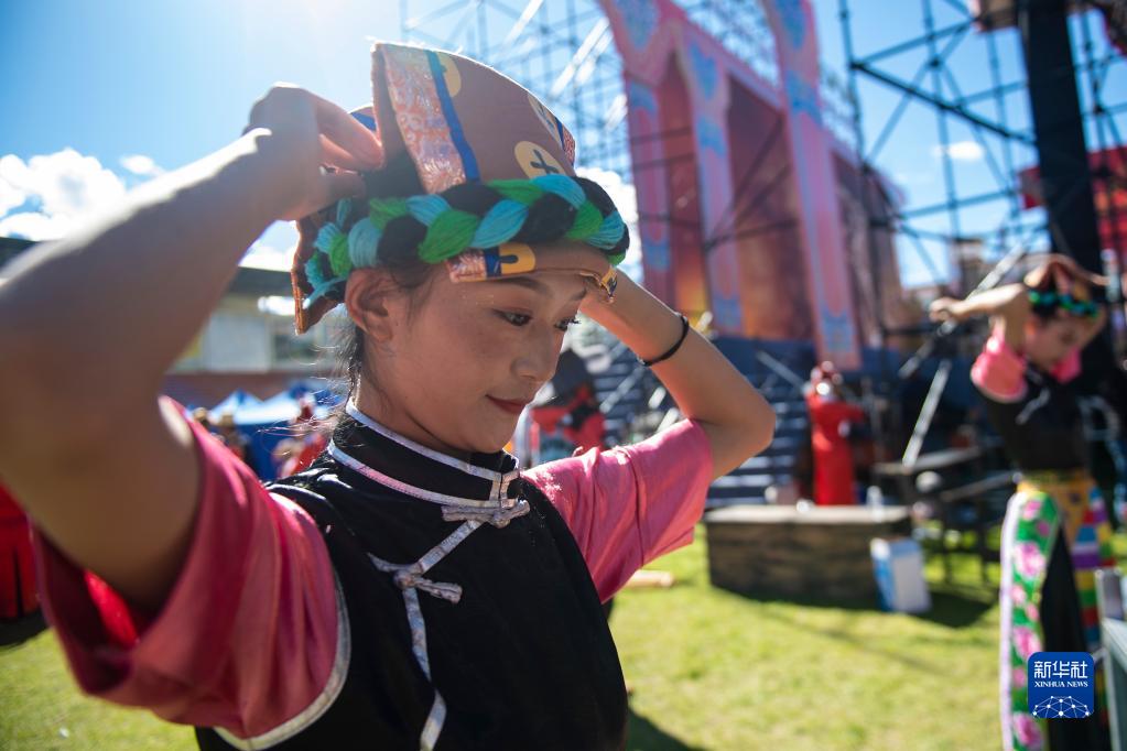 9月13日,參加2021雅礱文化旅游節(jié)開幕式文藝演出的演員在登臺表演前整理服裝。新華社記者 孫瑞博 攝