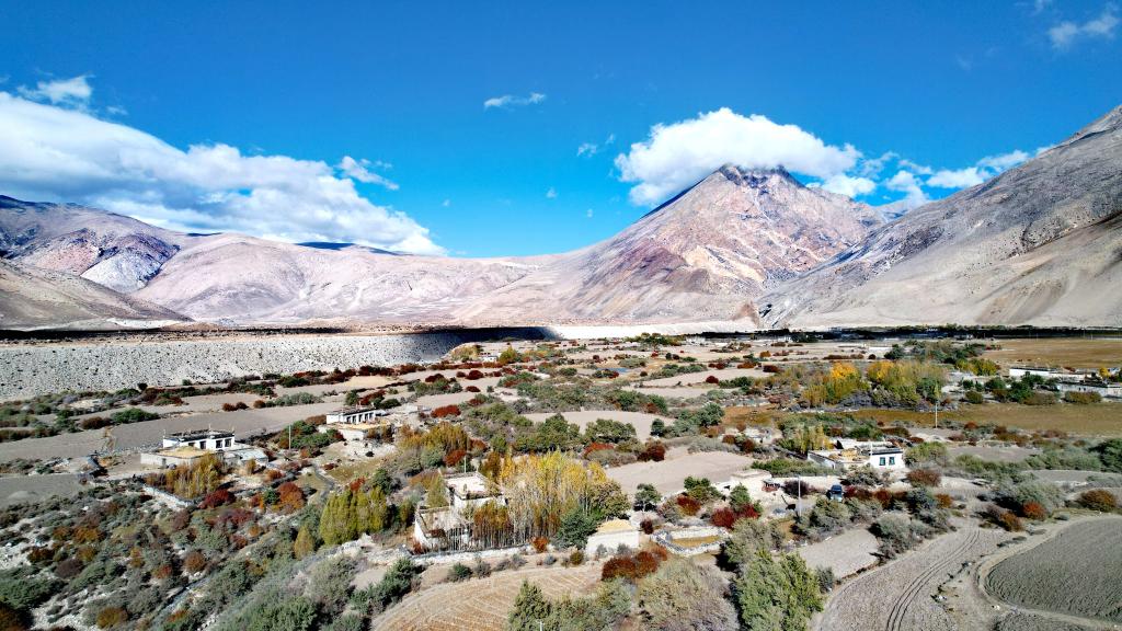 十月下旬,記者驅(qū)車來到曲當(dāng)鄉(xiāng)參木達村。透過航拍中的無人機遙控器顯示屏,記者看到,藏式民居在秋色浸染的樹木映襯下錯落有致,秋日照耀下色彩斑斕,村東有巍峨的雪山、村西是奔騰南去的河流。