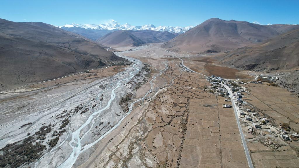 最寬闊處的扎嘎曲。圖的上方為珠峰,右邊為巴松村。新華社記者劉詩平攝