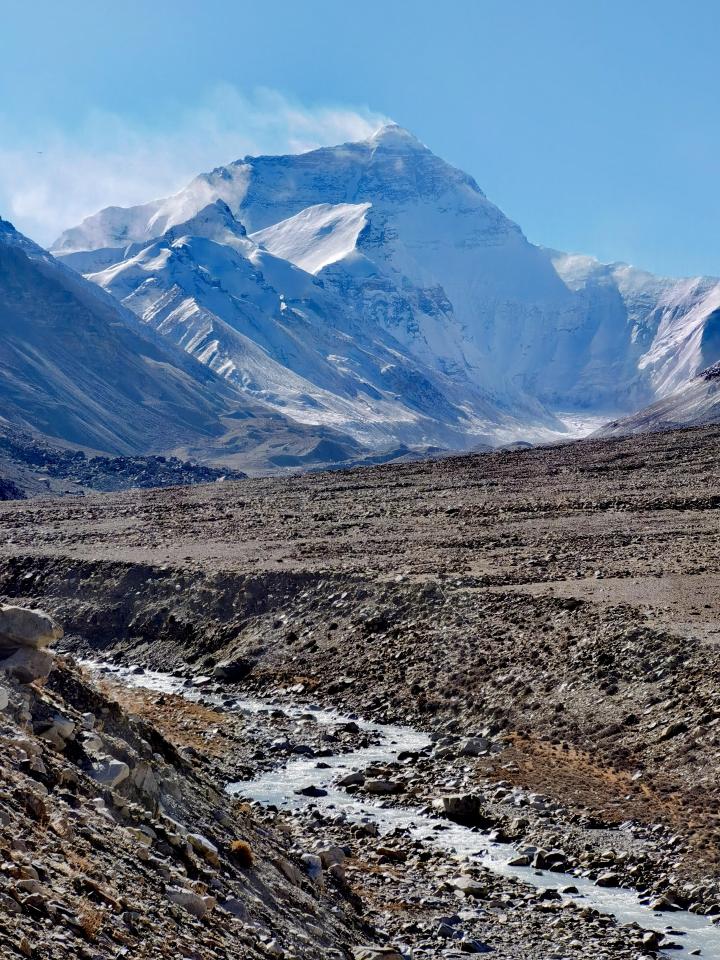 來到曲宗村,從這里搭乘珠穆朗瑪峰景區(qū)運營的環(huán)??蛙?,前往絨布寺附近海拔5000米左右的游客大本營。一路上坡,河流與公路隨行,偶爾可見有支流匯入扎嘎曲。