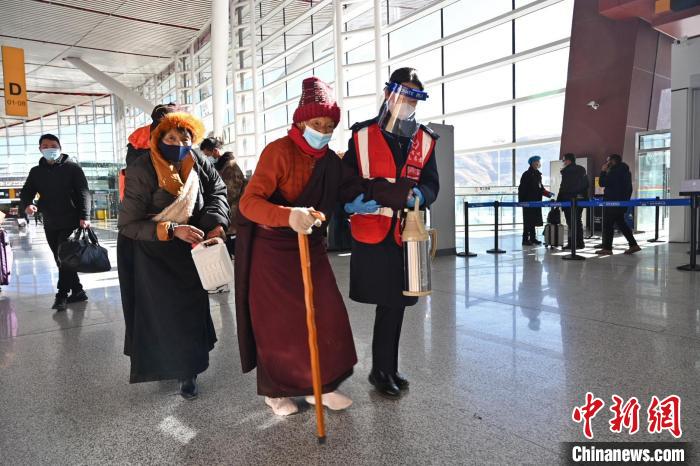 圖為在拉薩貢嘎機場,多個臨時點位安排了志愿者為旅客提供服務。貢嘎來松 攝