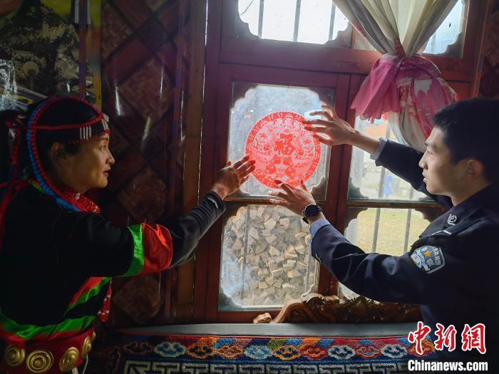 圖為林芝達(dá)木邊境派出所民警為轄區(qū)民眾貼窗花?!⊥鯘?攝