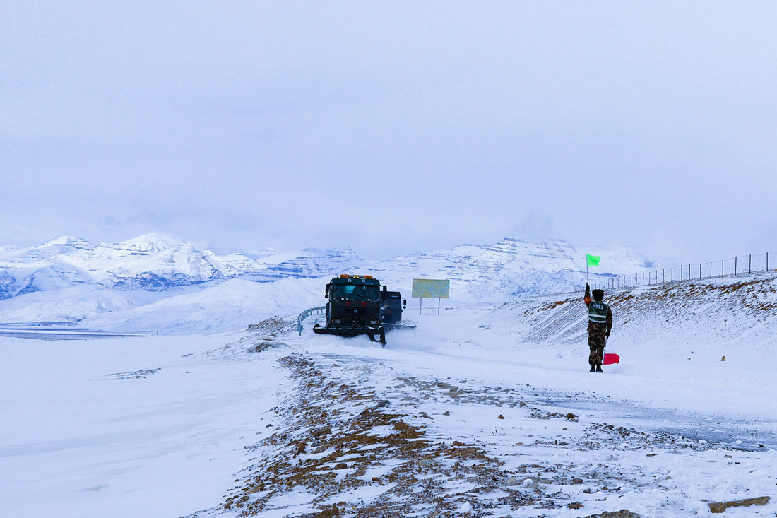 因?yàn)?zāi)害現(xiàn)場(chǎng)地處平均海拔4000多米以上海拔,持續(xù)降雪不斷,加之氣溫低至零下20多攝氏度,給整個(gè)道路搶通工作帶來(lái)了不少難度。為盡快清理路面積雪搶通道路,武警官兵采取“人歇機(jī)不停、分段搶通、先通后拓”的方法進(jìn)行全力搶通,克服了高寒缺氧及紫外線(xiàn)強(qiáng)烈等重重困難。