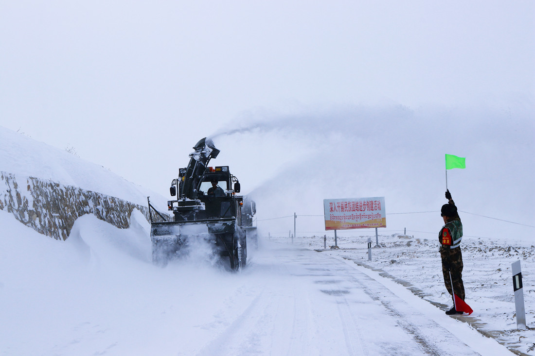 圖為武警官兵正在新藏線(xiàn)馬莜木拉段清理積雪。