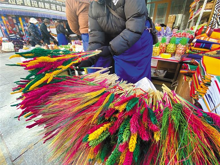堆龍德慶區(qū)桑木社區(qū)五組,家家戶戶都會(huì)制作“羅薩美朵”并在藏歷新年前售賣。“‘羅薩美朵’是一種經(jīng)過染色、手工制作、色彩各異的麥穗狀花朵,每年春季播種,金秋時(shí)節(jié)收獲,懸掛風(fēng)干,完好保存。到了藏歷11月,采購染色的顏料和捆扎用的毛線繩,把早已收割晾曬好的‘羅薩美朵’拿出來,為其染色、捆扎,然后拿到市區(qū)進(jìn)行銷售?!鄙D旧鐓^(qū)五組居民達(dá)珍告訴記者。