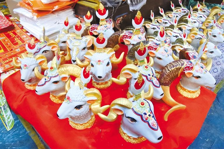 “隆果”也只在藏歷新年前出售,是藏歷新年必備的年貨之一,從新年的初一到十五期間擺放在家里,其余時(shí)間,即便是在常年熱鬧的沖賽康市場也很難尋見,所以當(dāng)看到塑彩羊頭時(shí),也就代表年關(guān)將至。