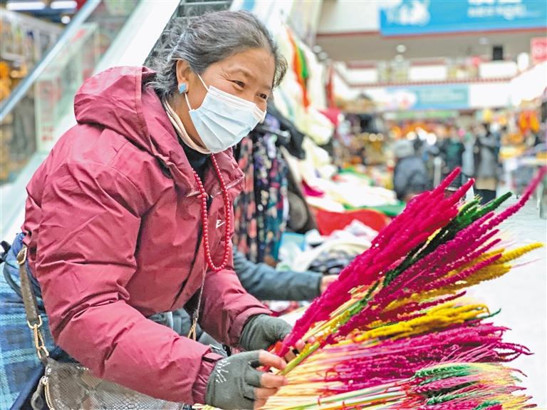 在雪域亙古浩瀚的歷史中,高原兒女自古以來便認定“羊”是吉祥的動物,代表了藏族群眾祈盼來年五谷豐登、六畜興旺。塑彩羊頭在藏語中稱為“隆果”,一般擺放在新年布置的貢品中央。“爸媽去年購買了一種用石灰制作的塑彩羊頭,今年我想購買陶瓷制作的塑彩羊頭放在爸媽家,去年買的拿回自己家,這樣既環(huán)保,也讓老人開心。”市民索朗旺堆在年貨攤位購買“隆果”時說。