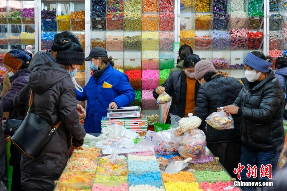 目前正值藏歷12月下旬,西藏即將迎來傳統(tǒng)藏歷水虎新年,拉薩民眾也全面進(jìn)入“藏歷新年時(shí)間”。2月27日下午,小新在西藏最大的傳統(tǒng)綜合市場——拉薩沖賽康市場周邊看到,羅薩美朵、卡塞、酥油、切瑪盒、糖果、干果、藏式服裝等年貨琳瑯滿目,購買的市民也進(jìn)入“最后”的采購時(shí)間,市場周圍人群絡(luò)繹不絕,高原迎春、年味十足。圖為一商販在拉薩沖賽康市場周邊銷售藏歷新年年貨“褪”。江飛波 攝
