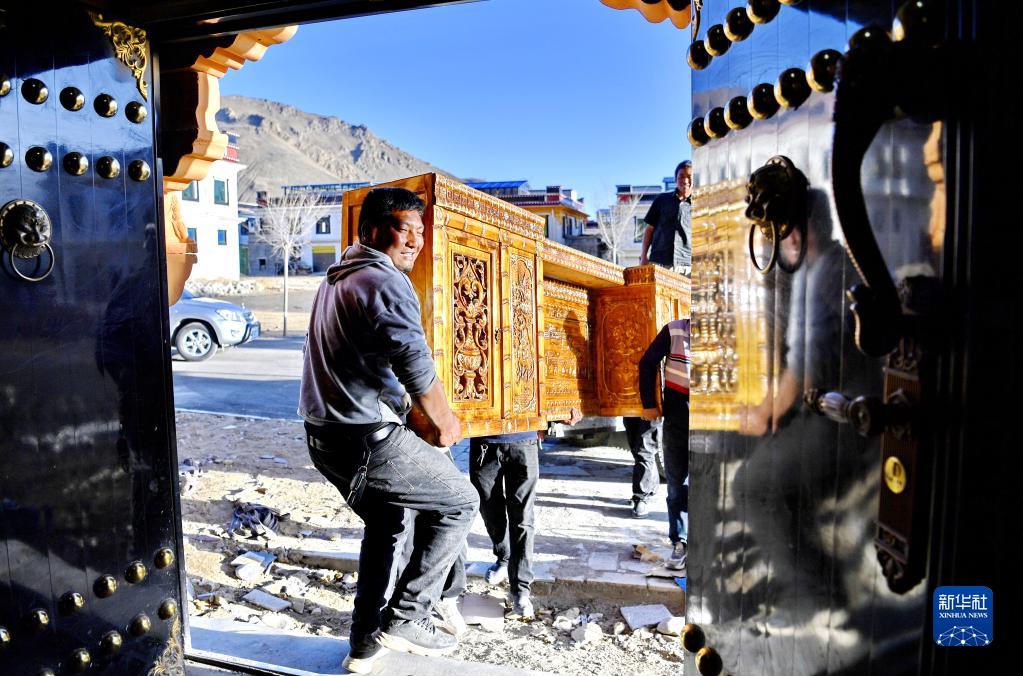 次旺堅(jiān)參(左)將家具搬進(jìn)位于湘河水庫(kù)移民新村的新家(3月27日攝)。新華社記者 張汝鋒 攝