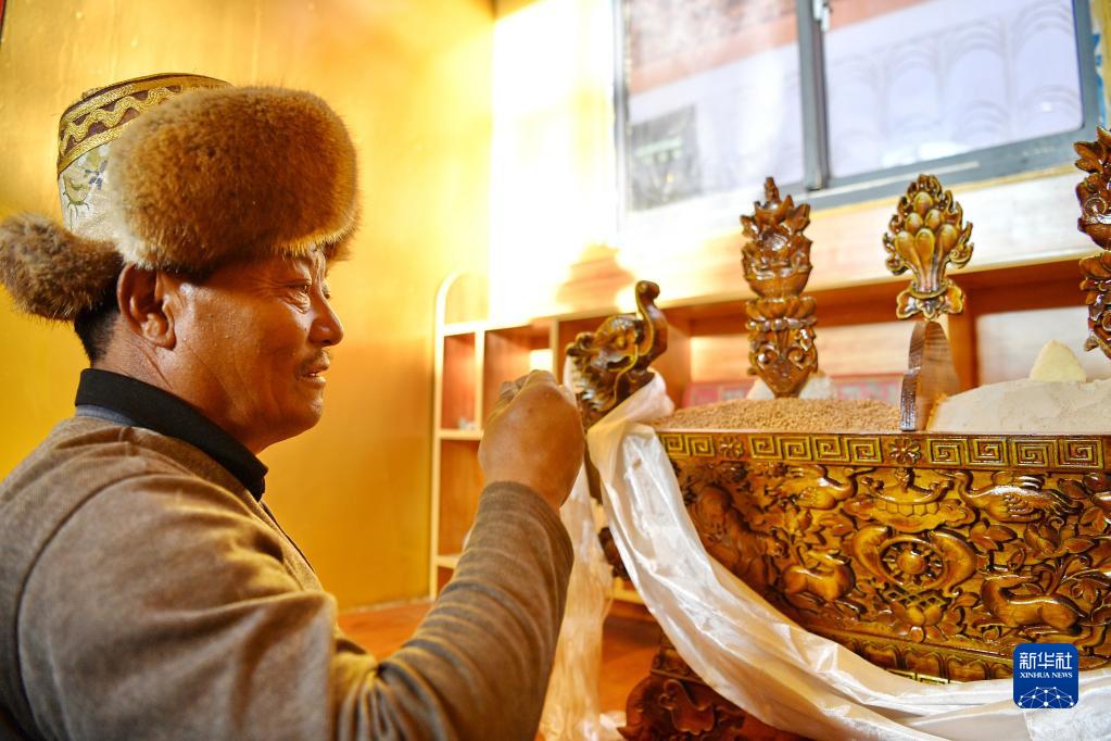 在湘河水庫(kù)移民新村,搬遷群眾羅布占堆在新家的切瑪盒前祈福(3月27日攝)。新華社記者 張汝鋒 攝