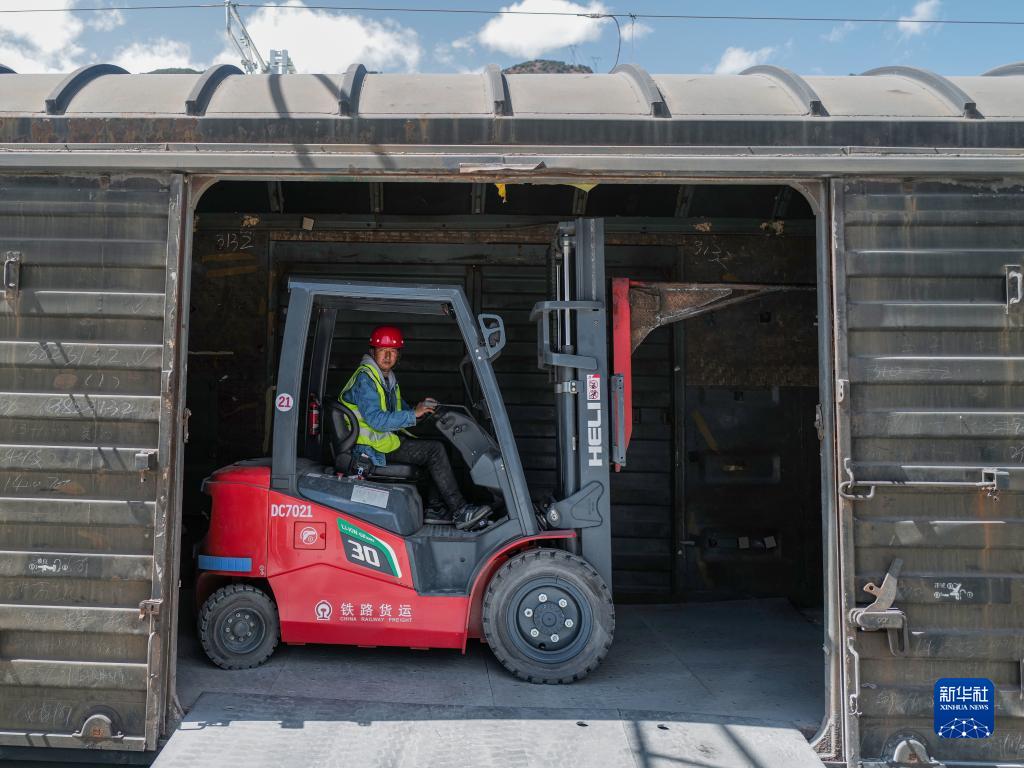 林芝市巴宜區(qū)布久鄉(xiāng)朵當(dāng)村村民邊巴在林芝站貨場(chǎng)駕駛叉車(chē)(3月29日攝)。新華社記者 洛卓嘉措 攝