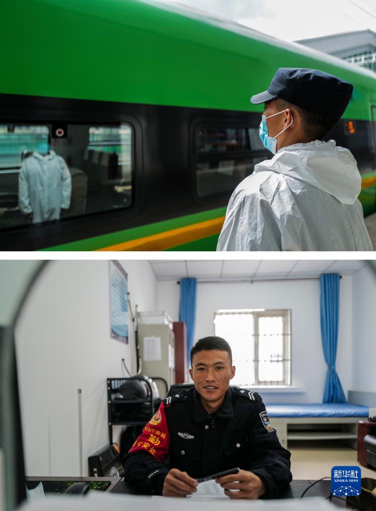 拼版照片:上圖為3月31日,白瑪旺扎在列車(chē)即將駛離車(chē)站時(shí)執(zhí)勤(新華社記者洛卓嘉措攝);下圖為白瑪旺扎在派出所接待窗口(新華社記者劉潁攝)。今年24歲的白瑪旺扎2021年8月起在林芝站派出所擔(dān)任輔警,他的家位于離車(chē)站3公里的麥巴村。鐵路的開(kāi)通讓他解決了就業(yè),同時(shí)還能照顧家庭。新華社發(fā)