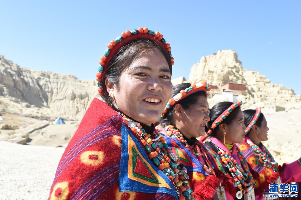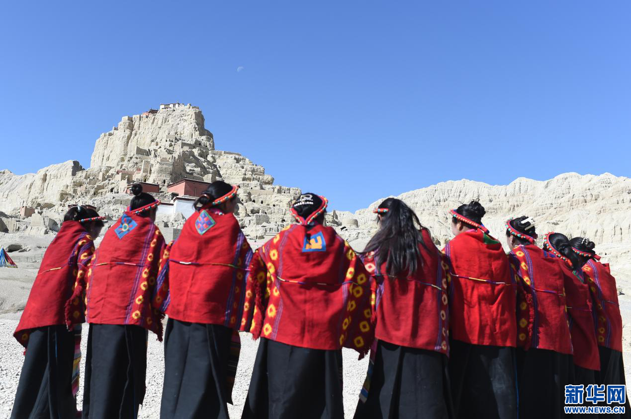 4月23日,當?shù)厝罕娫诠鸥裢醭z址腳下準備表演宣舞。新華網(wǎng) 旦增努布攝