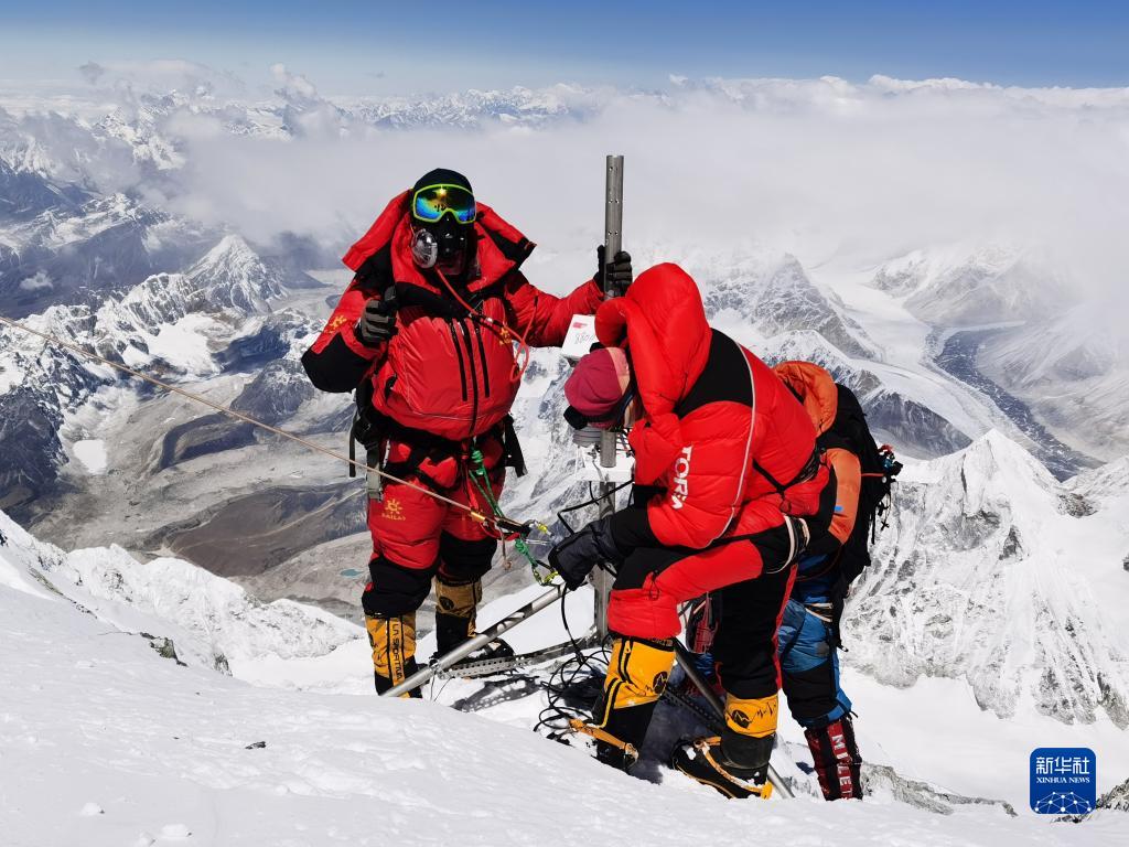 1個多小時后,氣象站架設成功。此時,部分隊員已經(jīng)登上頂峰開展雷達測量雪深、采集冰雪樣品等科研工作。德慶歐珠說,13名科考隊員全部登頂時,珠峰南坡的云慢慢爬上來,隊員們仿佛站在天上,比云還高。
